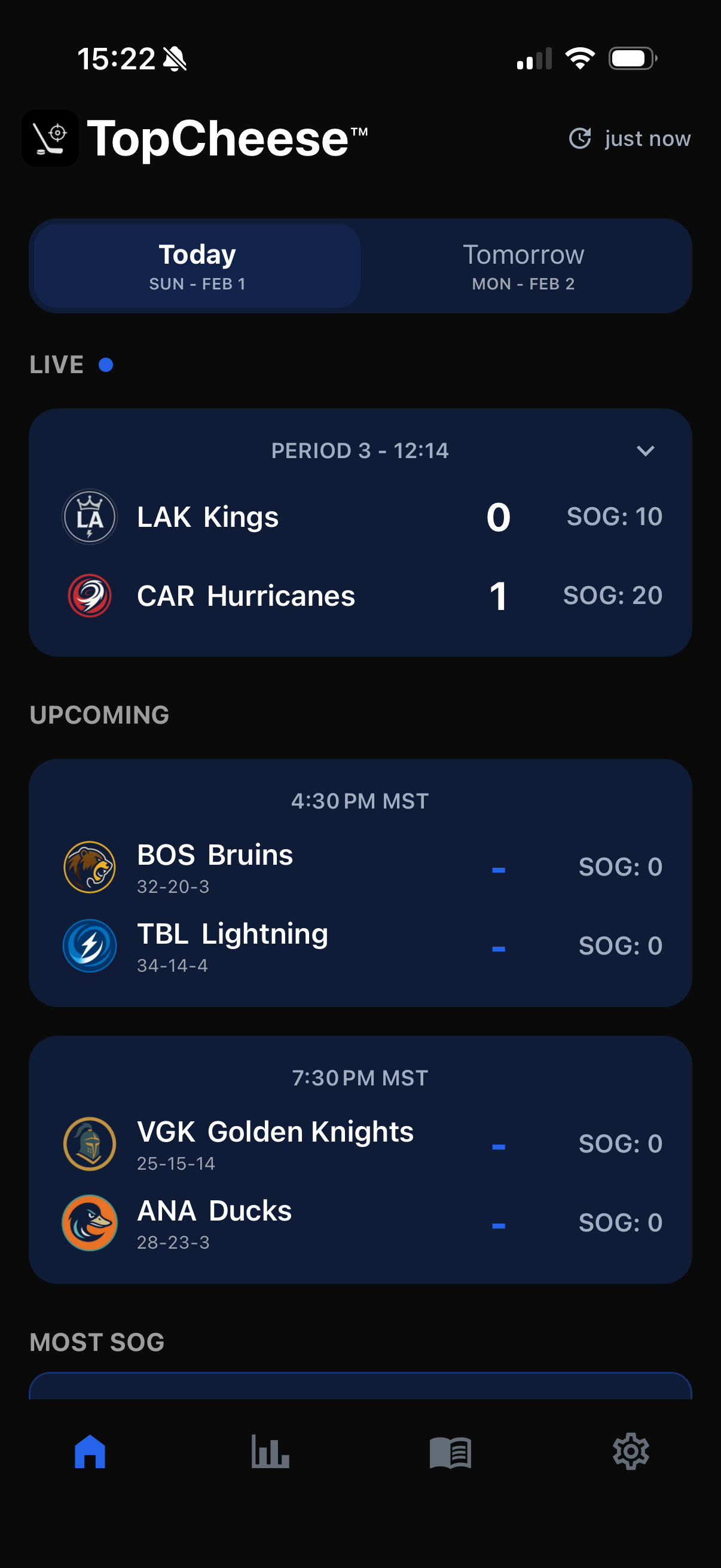Real-time SOG tracking, heat indicators, game previews, and more — in one app.